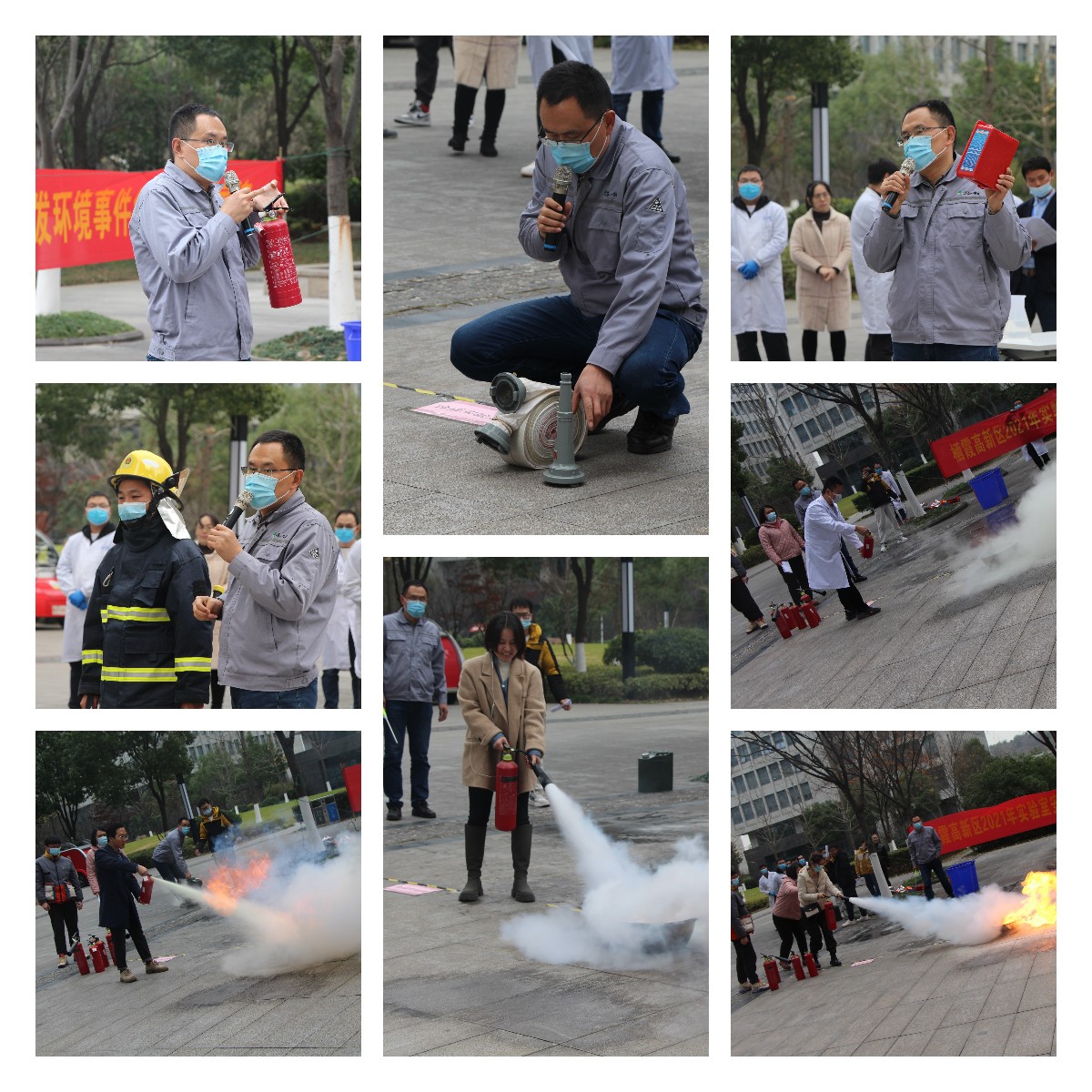 演習開始,受邀出席的第三方代表——南京中安安全技術服務有限公司高級工程師為參加演習的各位園區企業代表重點講解了危化品應急救援的實際操作。包括滅火器的配置規格、使用范圍以及日常消防水槍水帶等的使用規范。此外,現場還將理論與實際相結合,搭設模擬著火臺,鼓勵全員參與。活動現場氣氛活躍,參與度滿滿!