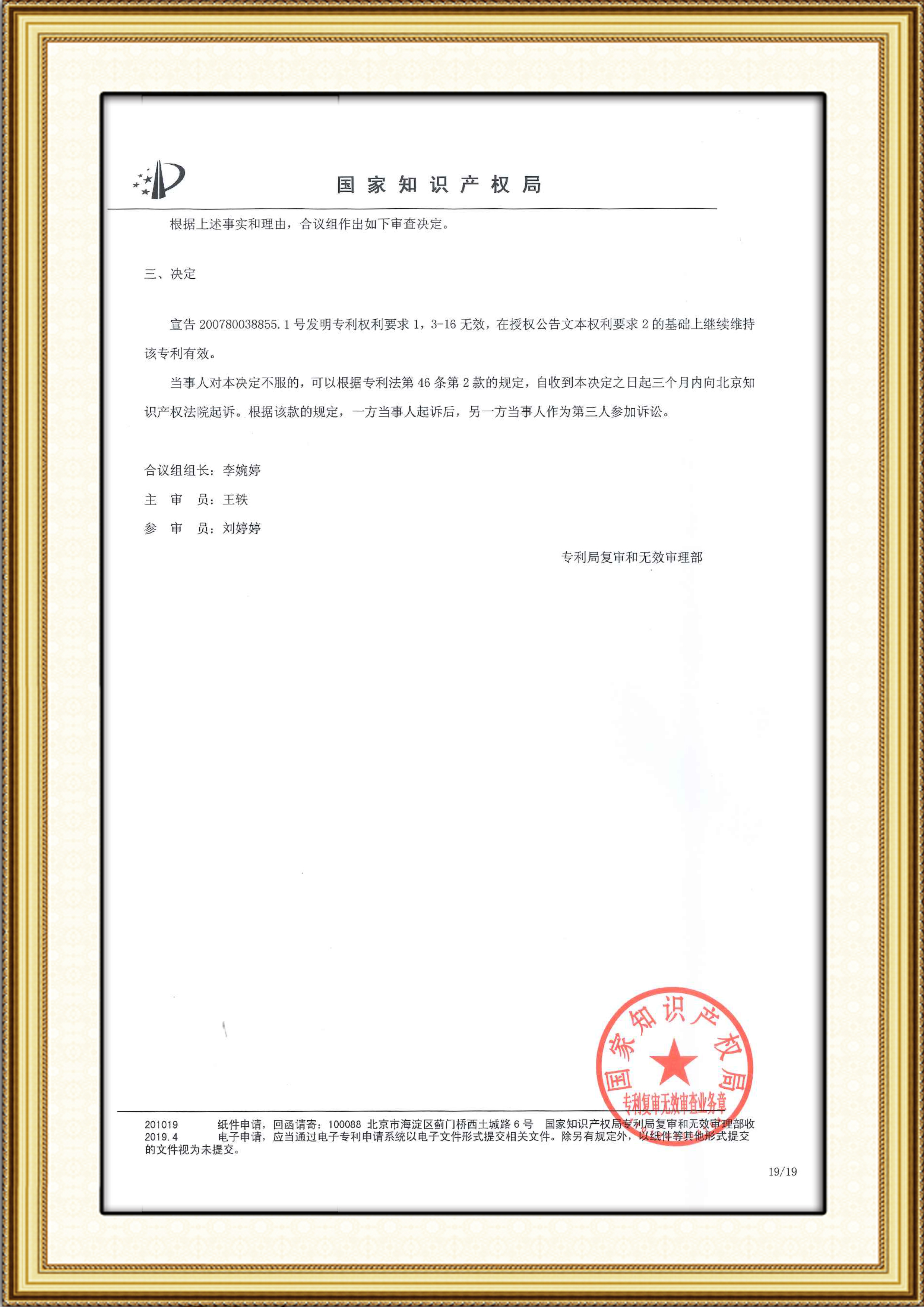 近日,我司收到國家知識產(chǎn)權(quán)局復(fù)審與無效審理部針對專利200780038855.1的無效宣告案件作出第53361號無效決定,宣告專利權(quán)部分無效(權(quán)1、3-16無效,權(quán)2維持有效)。因為在僅“權(quán)利要求2維持有效”的基礎(chǔ)上,請求人制備的產(chǎn)品將不會落入該保護范圍內(nèi),達(dá)到了本次專利無效挑戰(zhàn)的目的。