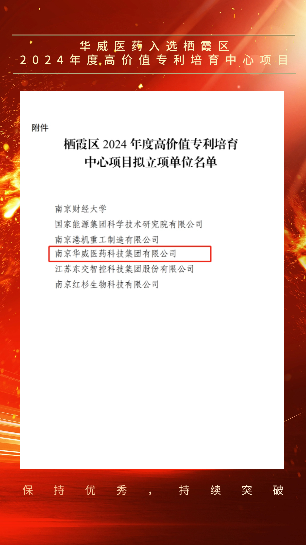 此次成功入選“棲霞區(qū)2024年度高價(jià)值專利培育中心項(xiàng)目”,標(biāo)志著華威醫(yī)藥在技術(shù)創(chuàng)新、專利布局等方面取得了顯著成效。這是對我們過去工作的肯定,更是對未來發(fā)展的激勵(lì)。今后,我們將以此為契機(jī),進(jìn)一步加強(qiáng)技術(shù)創(chuàng)新能力,優(yōu)化專利管理機(jī)制,加快科技成果的轉(zhuǎn)化應(yīng)用,不斷探索和實(shí)踐新的研發(fā)模式,持續(xù)提升企業(yè)的核心競爭力。