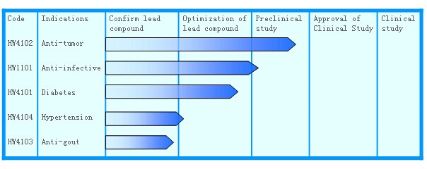 Huawe medical focus on the antitumor, anti infection and treatment of gout, hypertension and diabetes such as a class of new drugs research and development, our development targets, including the international leading novel targets and has been fully validated clinical targets. At present, we have launched a number of new drug development.